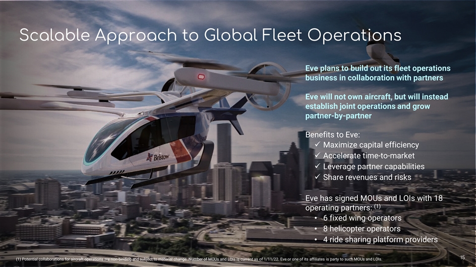 Scalable Approach to Global Fleet Operations Eve plans to build out its fleet operations business in collaboration with partners Eve will not own aircraft, but will instead establish joint operations and grow partner-by-partner Benefits to Eve: ü Maximize capital efficiency ü Accelerate time-to-market ü Leverage partner capabilities ü Share revenues and risks Eve has signed MOUs and LOIs with 18 (1) operating partners: • 6 fixed wing operators • 8 helicopter operators • 4 ride sharing platform providers 15 (1) Potential collaborations for aircraft operations are non-binding and subject to material change. Number of MOUs and LOIs is current as of 1/11/22. Eve or one of its affiliates is party to such MOUs and LOIs.