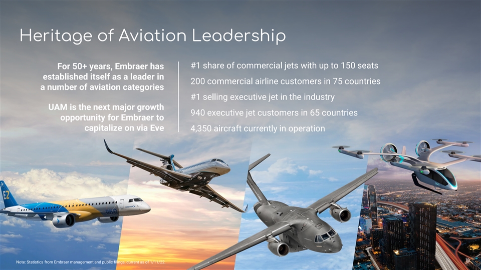 Superior Certification Track Record Eve plans to leverage Embraer’s regulatory experience and relationships to accelerate type certification Years From Start of Development to Certification 1 2 3 4 5 6 7 8 9 10 11 12 13 14 15 16 17 18 30+ E-Jets E2: Certified in Feb 2018 (New Aircraft) On Budget, On Spec, Two Months New models certified Ahead of Schedule by Embraer over the last 25 years Competitor A (Re-Engine) Competitor A (New Aircraft) Experience with Simultaneous Competitor B (New Aircraft) Certifications Competitor B (Re-Engine) Embraer has consistently achieved triple type certification Competitor C (New Aircraft) in Brazil, US and Europe for both commercial and executive jets Competitor D (New Aircraft) Program Planned Program Type Launched EIS Paused Certification 19