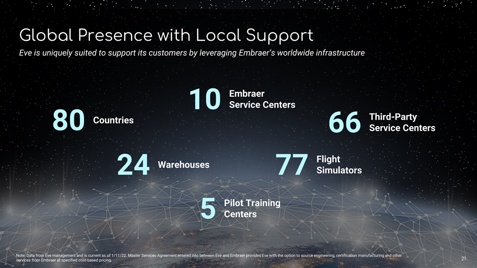 Leveraging World-Class Capabilities of Embraer Significant cost advantage over startups (1) ü Service agreements with Embraer will provide Eve with vast resources at favorable rates ü Contribution of UAM IP and a royalty-free license to Embraer’s background IP (2) ü 5,000 Embraer employees will be available to support Eve on a first priority basis ü Includes 1,600 named engineers with world-class design and aeronautical expertise ü As-a-service model allows Eve to efficiently flex-up and flex-down resource utilization ü Eve benefits from Embraer’s infrastructure and cost-competitive production capabilities (1) Master Services Agreement to be entered into between Eve and Embraer provides Eve with the option to source engineering, certification manufacturing and other services from Embraer at specified cost-based pricing. 20 (2) Pursuant to Master Services Agreement entered into between Eve and Embraer.