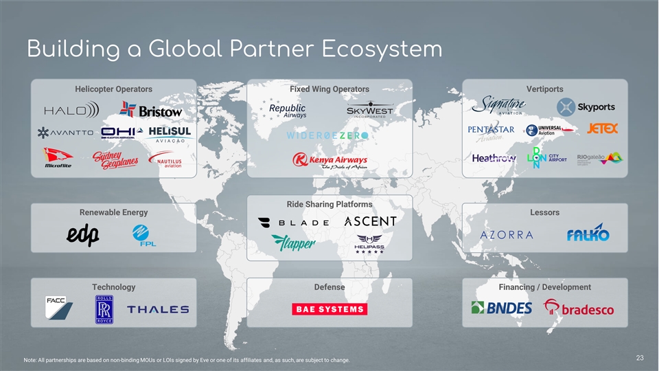 Building a Global Partner Ecosystem Helicopter Operators Fixed Wing Operators Vertiports Ride Sharing Platforms Renewable Energy Lessors Technology Defense Financing / Development 23 Note: All partnerships are based on non-binding MOUs or LOIs signed by Eve or one of its affiliates and, as such, are subject to change.
