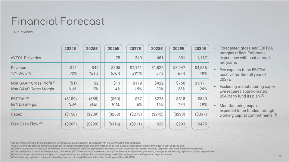 Revenue Growth Plan $ in millions $4,536 • eVTOL revenue is expected to begin scaling in 2026E with 18% planned entry into service 2030E • Fleet operations and service and support revenues are Revenue $3,047 55% expected to reach 44% of total Mix 26% revenue by 2030E • UATM is expected to be a 1% $1,825 strategic and high margin revenue source $1,161 $305 $45 $21 2024E 2025E 2026E 2027E 2028E 2029E 2030E eVTOL Fleet Operations Service and Support UATM 32 Source: Estimates are from Eve management.
