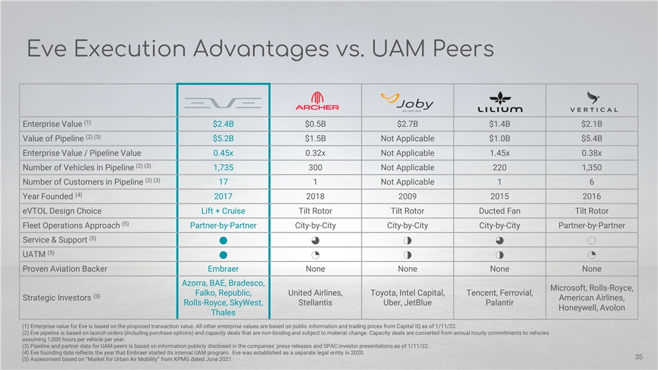 Transaction Overview $ in millions, except per share data Sources Pro Forma Valuation Embraer Rollover $2,200 Share Price $10.00 (1) Cash in Trust $237 Pro Forma Shares Outstanding 289.4 PIPE Equity $315 Equity Value $2,894 (2) Total Sources $2,752 Less: Net Cash $516 Enterprise Value $2,378 (1) Uses Pro Forma Ownership Embraer Rollover $2,200 PIPE Investors | 10.9% Cash to the Balance Sheet $511 Embraer / Eve Zanite Public Shareholders | 7.9% (3) Rollover | 77.0% Estimated Fees and Expenses $41 Strategic Partner Warrants | 2.2% (4) Total Uses $2,752 Zanite Founder Shares | 2.0% Note: Transaction terms are subject to change. (1) Fully-diluted pro forma shares outstanding under the treasury stock method including: (i) 2.9M initial equity incentive shares granted to Eve employees at closing; and (ii) 6.3M shares issuable upon the exercise of strategic partner penny warrants granted and vested at closing and subject to lock-ups of three to five years; and excluding: (i) 7.9M shares issuable upon the exercise of strategic partner penny warrants subject to milestone-based vesting; (ii) 17.0M shares issuable upon the exercise of strategic partner warrants with a $13.97 weighted average exercise price granted and vested at closing; (iii) 14.3M shares issuable upon the exercise of Zanite private placement warrants with an $11.50 exercise price vested at closing and subject to a three year lockup; (iv) 11.5M shares issuable upon the exercise of Zanite public warrants with an $11.50 exercise price vested at closing; and (v) any redemptions by Zanite public shareholders. (2) Comprised of $237M cash in trust (excluding any redemptions by Zanite public shareholders), $315M in PIPE proceeds and $5M of estimated Company net cash at Closing, minus $41M in estimated transaction expenses. (3) Embraer / Eve rollover excludes Embraer’s committed $175M investment in the PIPE, which is included in the PIPE investors ownership line. Embraer is expected to have 82.1% pro forma ownership including its PIPE investment. 34 (4) Zanite founder shares excludes Zanite Sponsor’s committed $25M investment in the PIPE, which is included in the PIPE investors ownership line. Zanite Sponsor is expected to have 2.9% pro forma ownership including its PIPE investment.