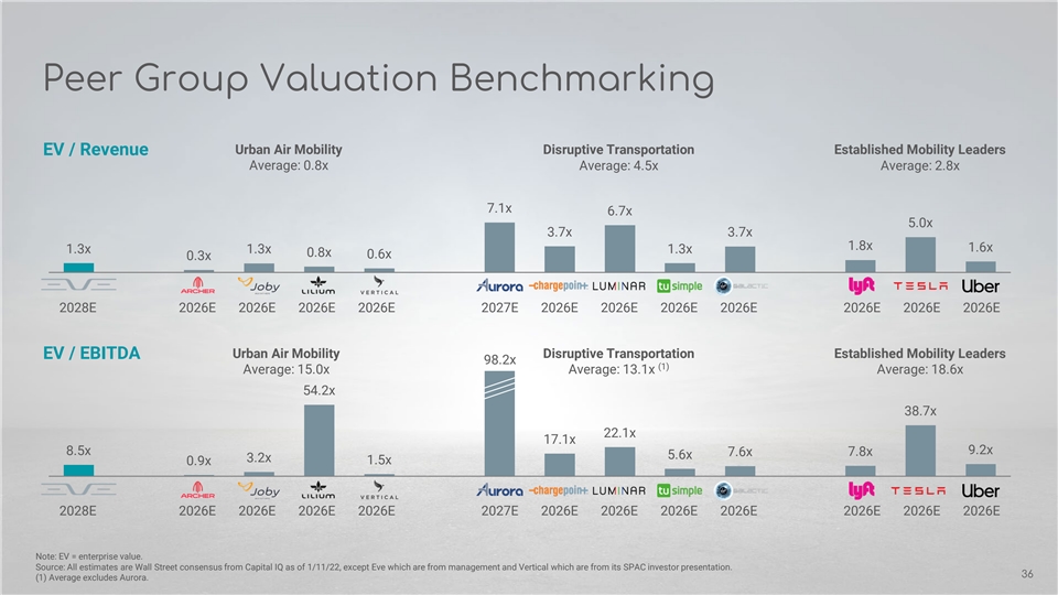 Peer Group Valuation Benchmarking Urban Air Mobility Disruptive Transportation Established Mobility Leaders EV / Revenue Average: 0.8x Average: 4.5x Average: 2.8x 7.1x 6.7x 5.0x 3.7x 3.7x 1.8x 1.6x 1.3x 1.3x 1.3x 0.8x 0.6x 0.3x 2028E 2026E 2026E 2026E 2026E 2027E 2026E 2026E 2026E 2026E 2026E 2026E 2026E Urban Air Mobility Disruptive Transportation Established Mobility Leaders EV / EBITDA 98.2x (1) Average: 15.0x Average: 13.1x Average: 18.6x 54.2x 38.7x 22.1x 17.1x 9.2x 8.5x 7.6x 7.8x 5.6x 3.2x 1.5x 0.9x 2028E 2026E 2026E 2026E 2026E 2027E 2026E 2026E 2026E 2026E 2026E 2026E 2026E Note: EV = enterprise value. Source: All estimates are Wall Street consensus from Capital IQ as of 1/11/22, except Eve which are from management and Vertical which are from its SPAC investor presentation. 36 (1) Average excludes Aurora.