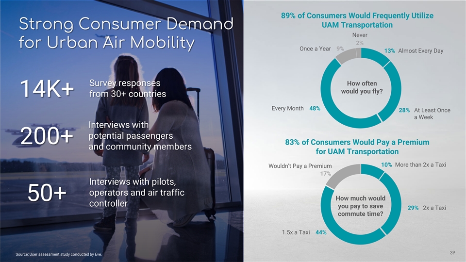 89% of Consumers Would Frequently Utilize UAM Transportation Strong Consumer Demand Never 2% for Urban Air Mobility Once a Year 9% 13% Almost Every Day Survey responses How often would you fly? 14K+ from 30+ countries Every Month 48% 28% At Least Once a Week Interviews with potential passengers 200+ 83% of Consumers Would Pay a Premium and community members for UAM Transportation 10% More than 2x a Taxi Wouldn’t Pay a Premium 17% Interviews with pilots, operators and air traffic How much would 50+ controller you pay to save 29% 2x a Taxi commute time? 1.5x a Taxi 44% 39 Source: User assessment study conducted by Eve.