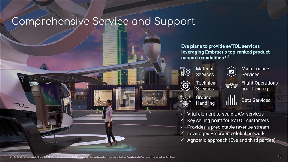 Designed to Deliver the Lowest Operational Cost Estimated Direct Operational Cost Per Seat for a Typical 30 km (20 mile) Trip $164 $135 $58 $47 $20 (1) Helicopter Multi-Rotor Tilt Rotor Eve Piloted Eve Autonomous 1 pilot / 6 passengers 1 pilot / 1 passenger 1 pilot / 4 passengers 1 pilot / 4 passengers 0 pilot / 6 passengers Source: Estimated helicopter costs are based on an analysis from Conklin & de Decker. All other costs are based on Eve analysis. 43 (1) Eve expects autonomous operations to commence around 2030.