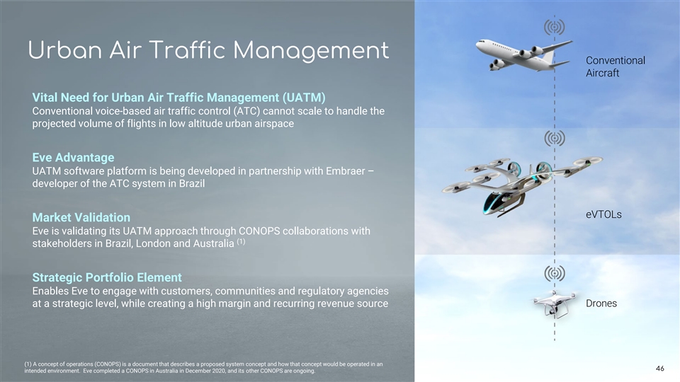 Urban Air Traffic Management Conventional Aircraft Vital Need for Urban Air Traffic Management (UATM) Conventional voice-based air traffic control (ATC) cannot scale to handle the projected volume of flights in low altitude urban airspace Eve Advantage UATM software platform is being developed in partnership with Embraer – developer of the ATC system in Brazil eVTOLs Market Validation Eve is validating its UATM approach through CONOPS collaborations with (1) stakeholders in Brazil, London and Australia Strategic Portfolio Element Enables Eve to engage with customers, communities and regulatory agencies Drones at a strategic level, while creating a high margin and recurring revenue source (1) A concept of operations (CONOPS) is a document that describes a proposed system concept and how that concept would be operated in an 46 46 intended environment. Eve completed a CONOPS in Australia in December 2020, and its other CONOPS are ongoing.