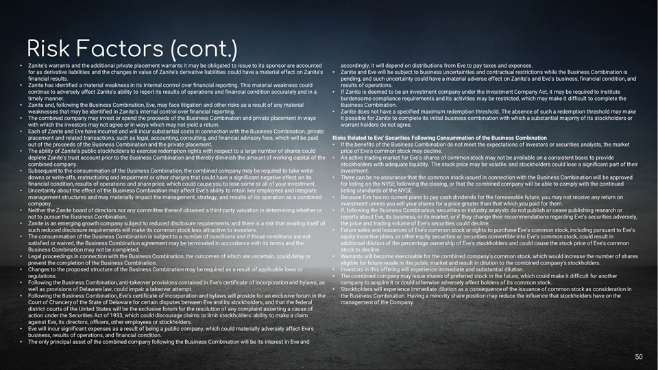 Risk Factors (cont.) • Zanite's warrants and the additional private placement warrants it may be obligated to issue to its sponsor are accounted accordingly, it will depend on distributions from Eve to pay taxes and expenses. for as derivative liabilities and the changes in value of Zanite's derivative liabilities could have a material effect on Zanite's • Zanite and Eve will be subject to business uncertainties and contractual restrictions while the Business Combination is financial results. pending, and such uncertainty could have a material adverse effect on Zanite's and Eve's business, financial condition, and • Zanite has identified a material weakness in its internal control over financial reporting. This material weakness could results of operations. continue to adversely affect Zanite's ability to report its results of operations and financial condition accurately and in a • If Zanite is deemed to be an investment company under the Investment Company Act, it may be required to institute timely manner. burdensome compliance requirements and its activities may be restricted, which may make it difficult to complete the • Zanite and, following the Business Combination, Eve, may face litigation and other risks as a result of any material Business Combination. weaknesses that may be identified in Zanite's internal control over financial reporting. • Zanite does not have a specified maximum redemption threshold. The absence of such a redemption threshold may make • The combined company may invest or spend the proceeds of the Business Combination and private placement in ways it possible for Zanite to complete its initial business combination with which a substantial majority of its stockholders or with which the investors may not agree or in ways which may not yield a return. warrant holders do not agree. • Each of Zanite and Eve have incurred and will incur substantial costs in connection with the Business Combination, private placement and related transactions, such as legal, accounting, consulting, and financial advisory fees, which will be paid Risks Related to Eve' Securities Following Consummation of the Business Combination out of the proceeds of the Business Combination and the private placement. • If the benefits of the Business Combination do not meet the expectations of investors or securities analysts, the market • The ability of Zanite's public stockholders to exercise redemption rights with respect to a large number of shares could price of Eve's common stock may decline. deplete Zanite's trust account prior to the Business Combination and thereby diminish the amount of working capital of the • An active trading market for Eve's shares of common stock may not be available on a consistent basis to provide combined company. stockholders with adequate liquidity. The stock price may be volatile, and stockholders could lose a significant part of their • Subsequent to the consummation of the Business Combination, the combined company may be required to take write- investment. downs or write-offs, restructuring and impairment or other charges that could have a significant negative effect on its • There can be no assurance that the common stock issued in connection with the Business Combination will be approved financial condition, results of operations and share price, which could cause you to lose some or all of your investment. for listing on the NYSE following the closing, or that the combined company will be able to comply with the continued • Uncertainty about the effect of the Business Combination may affect Eve's ability to retain key employees and integrate listing standards of the NYSE. management structures and may materially impact the management, strategy, and results of its operation as a combined • Because Eve has no current plans to pay cash dividends for the foreseeable future, you may not receive any return on company. investment unless you sell your shares for a price greater than that which you paid for them. • Neither the Zanite board of directors nor any committee thereof obtained a third-party valuation in determining whether or • If, following the Business Combination, securities or industry analysts do not publish or cease publishing research or not to pursue the Business Combination. reports about Eve, its business, or its market, or if they change their recommendations regarding Eve's securities adversely, • Zanite is an emerging growth company subject to reduced disclosure requirements, and there is a risk that availing itself of the price and trading volume of Eve's securities could decline. such reduced disclosure requirements will make its common stock less attractive to investors. • Future sales and issuances of Eve's common stock or rights to purchase Eve's common stock, including pursuant to Eve's • The consummation of the Business Combination is subject to a number of conditions and if those conditions are not equity incentive plans, or other equity securities or securities convertible into Eve's common stock, could result in satisfied or waived, the Business Combination agreement may be terminated in accordance with its terms and the additional dilution of the percentage ownership of Eve's stockholders and could cause the stock price of Eve's common Business Combination may not be completed. stock to decline. • Legal proceedings in connection with the Business Combination, the outcomes of which are uncertain, could delay or • Warrants will become exercisable for the combined company's common stock, which would increase the number of shares prevent the completion of the Business Combination. eligible for future resale in the public market and result in dilution to the combined company's stockholders. • Changes to the proposed structure of the Business Combination may be required as a result of applicable laws or • Investors in this offering will experience immediate and substantial dilution. regulat