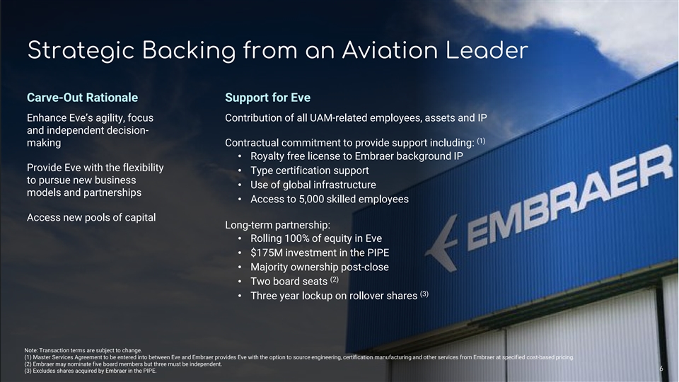Transaction Overview Business Combination Details Valuation Capital Structure Embraer transfer of UAM Business to EVE UAM, LLC Anticipated pro forma enterprise Expected to be funded by $237M cash in trust (assuming ( Eve ), with a commitment to provide certain services value of $2.4B no redemptions) and net proceeds from a $315M PIPE (2) to Eve following the transaction resulting in estimated pro forma net cash of $516M Implied valuation multiples: Exchange of Eve units to Zanite for 220M shares of • 1.3x 2028E revenue PIPE consists of: Zanite common stock • 8.5x 2028E EBITDA • $175M from Embraer • $25M from Zanite Sponsor Eve will become a wholly owned subsidiary of Zanite, Provides investors with an attractive • $115M from other investors which will change its name to Eve Holding, Inc. at close entry point based on non-binding (3) and be listed on the NYSE under the symbol “EVEX” pipeline and peer group multiples Anticipated pro forma ownership: (4) • 77.0% Embraer / Eve rollover Expected to close in Q2 2022 • 10.9% PIPE investors Strategic PIPE Investors • 7.9% Zanite public shareholders 7 person board (4 independent) • 2.2% Strategic partner warrants (5) Embraer governance: • 2.0% Zanite founder shares • Ordinary 1:1 voting rights (1) • Consent right for major corporate changes Note: Transaction terms are subject to change. (1) Major corporate changes include a sale, dissolution, relocation, name change, change in the size of the board or any action that would materially adversely affect any approval right to which Embraer is entitled. Embraer’s consent right is retained so long as Embraer’s ownership remains at or above 35%. (2) Comprised of $237M cash in trust (excluding any redemptions by Zanite public shareholders), $315M in PIPE proceeds and $5M of estimated Company net cash at Closing, minus $41M in estimated transaction expenses. Eve’s funding expectations are subject to change based on a variety of factors, including shareholder redemptions and greater than expected losses. (3) Based on Eve’s 289.4M fully-diluted pro forma shares outstanding under the treasury stock method including: (i) 2.9M initial equity incentive shares granted to Eve employees at closing; and (ii) 6.3M shares issuable upon the exercise of strategic partner penny warrants granted and vested at closing and subject to lock-ups of three to five years; and excluding: (i) 7.9M shares issuable upon the exercise of strategic partner penny warrants subject to milestone-based vesting; (ii) 17.0M shares issuable upon the exercise of strategic partner warrants with a $13.97 weighted average exercise price granted and vested at closing; (iii) 14.3M shares issuable upon the exercise of Zanite private placement warrants with an $11.50 exercise price vested at closing and subject to a three year lockup; (iv) 11.5M shares issuable upon the exercise of Zanite public warrants with an $11.50 exercise price vested at closing; and (v) any redemptions by Zanite public shareholders. (4) Embraer / Eve rollover line excludes Embraer’s committed $175M investment in the PIPE, which is included in the PIPE investors ownership line. Embraer is expected to have 82.1% pro forma ownership including its PIPE investment. 5 (5) Zanite founder shares line excludes Zanite Sponsor’s committed $25M investment in the PIPE, which is included in the PIPE investors ownership line. Zanite Sponsor is expected to have 2.9% pro forma ownership including its PIPE investment.